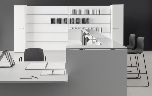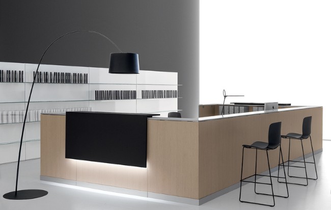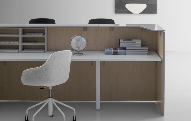 Le comptoir d’accueil Qubo de DVO est conçu à partir d’un système modulaire aux lignes épurées pour une première impression positive.